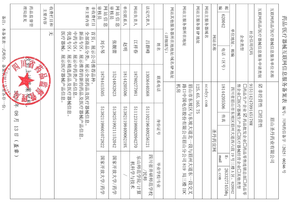互联网药品信息服务资格证书:川网药信备字〔2025〕00246号     变更记录证书:变更记录证书 医疗器械网销备案: 川眉食药监械经营许202000001